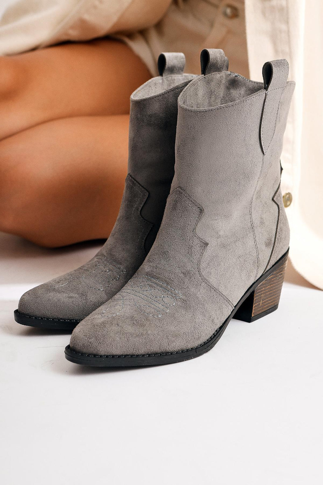 Joo – Grau Velours Stiefelette mit Stickerei und Western-Detail, mit spitzer Zehenpartie (Damen)