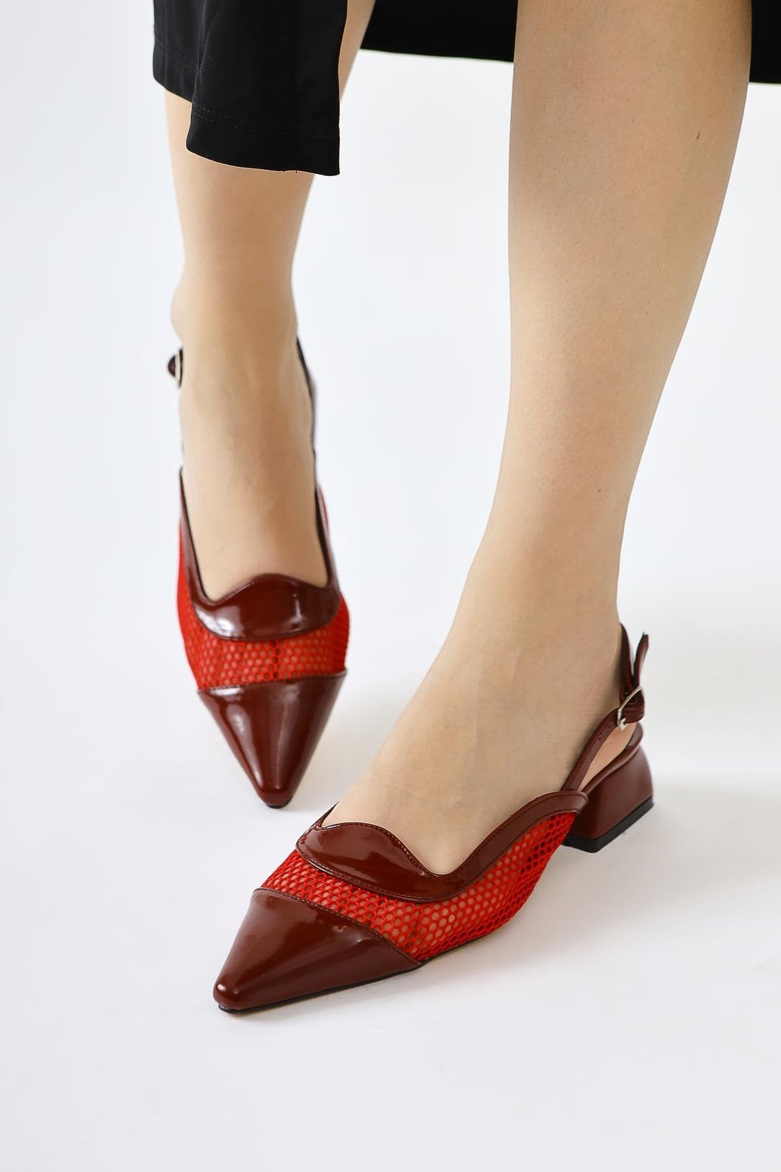 Thamara – Burgunder Lack Schuh mit spitzer Zehenpartie, Netz-Detail und niedrigem Absatz (Damen)