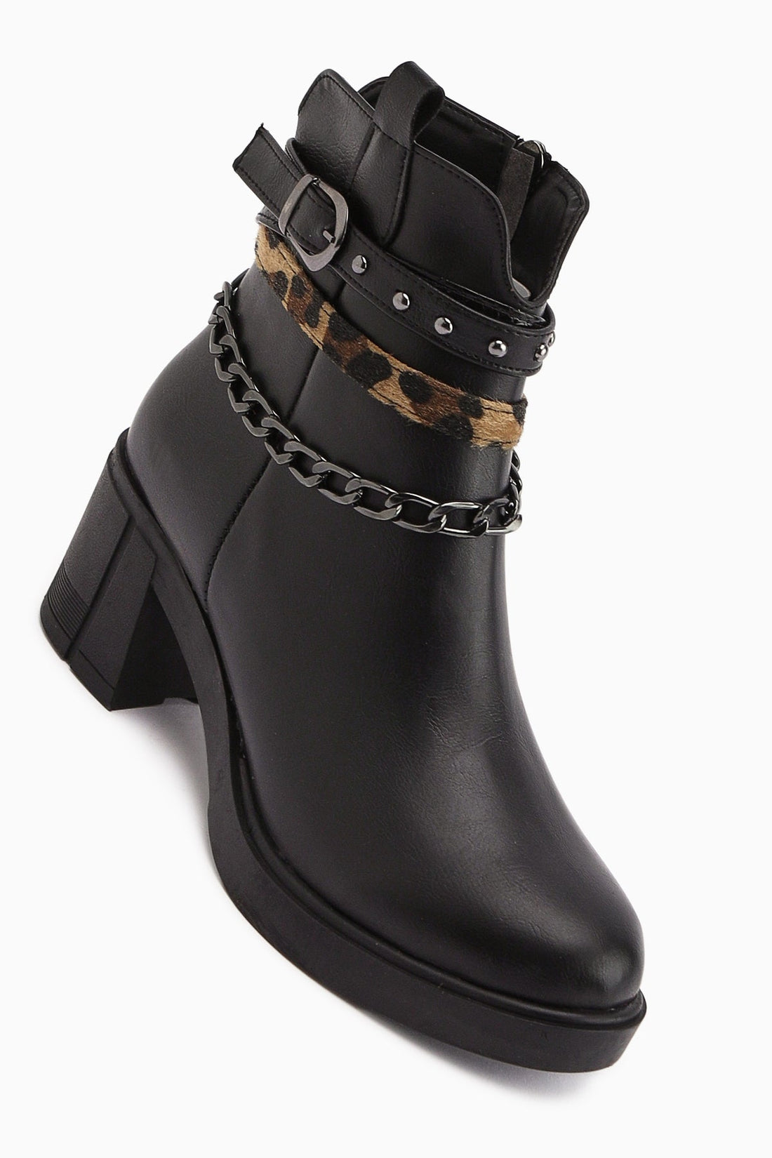 Anissa – Schwarz Stiefelette mit Ketten- und Riemen-Detail, Blockabsatz (Damen)