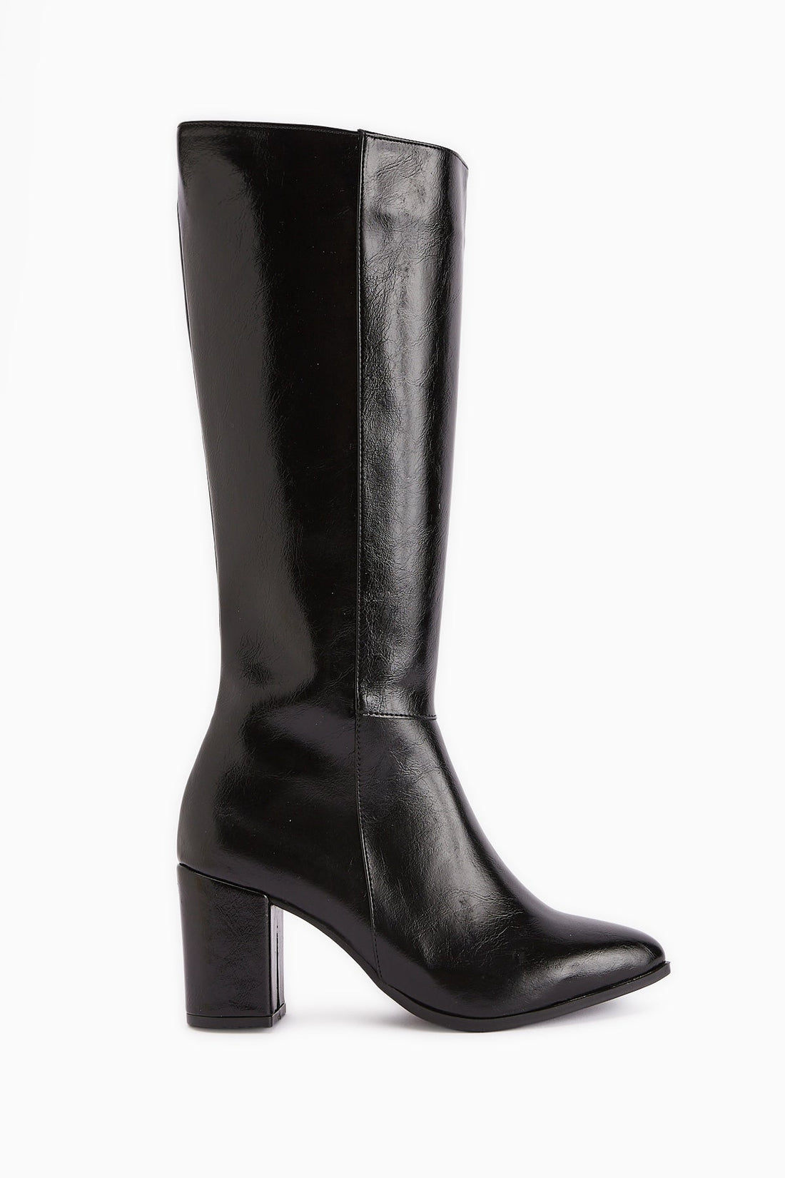 Tatum Black Wrinkled Patent Pointed Mid Heeled Boot