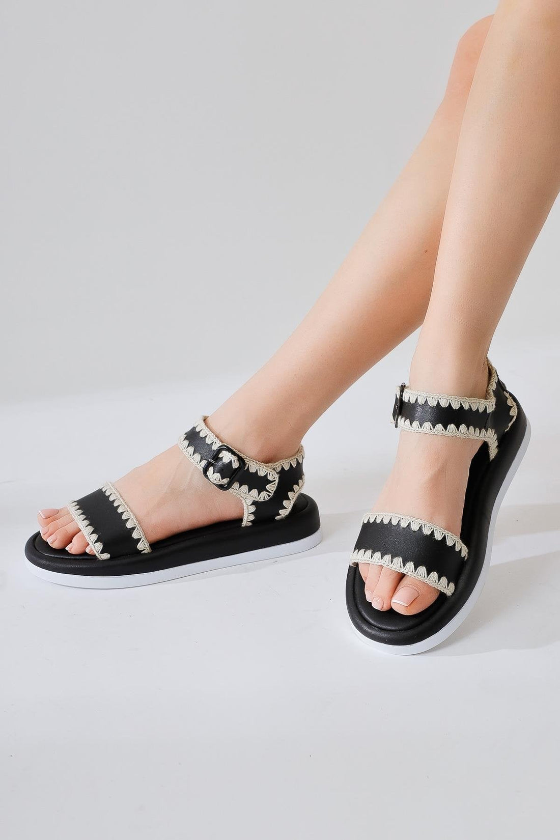 Nonna Schwarze Bestickte Sandale mit Dicker Riemen