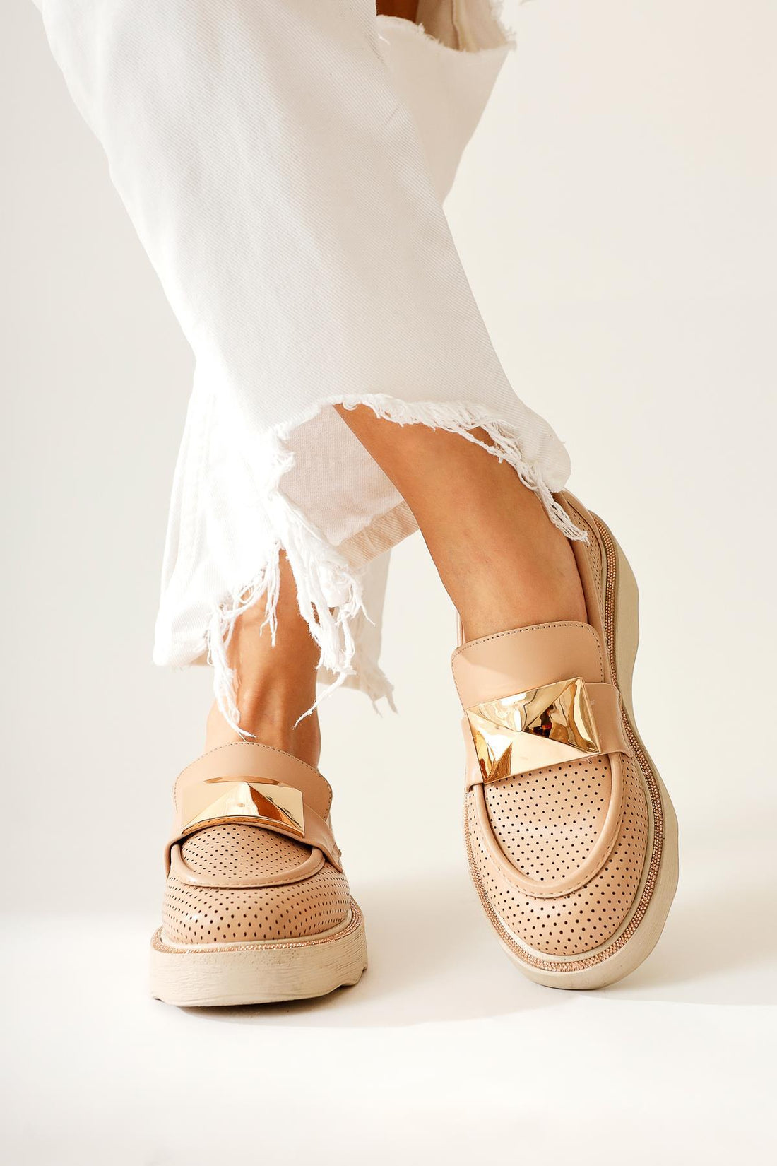 Khloe Beige Schnallen Detail Perforierte Mokassin Schuhe