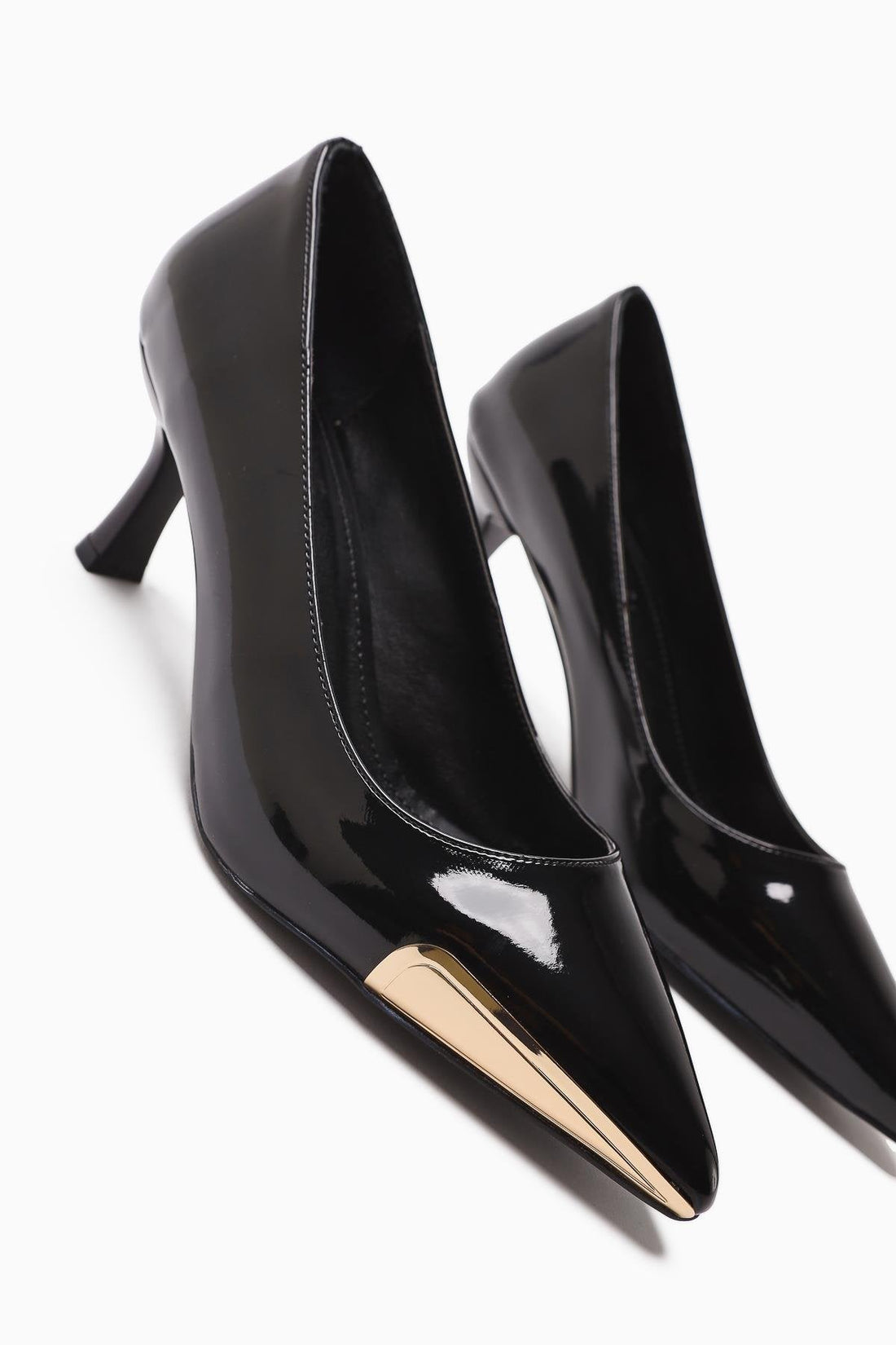 Lelia – Black Patent Vegan Material Metal-Toe Detail Heeled Shoe (Women)