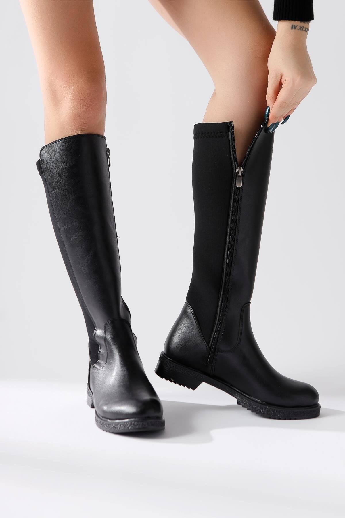 Benedikta – Black Oval-Toe Neoprene Fabric-Detail Knee-High Boot (Women)