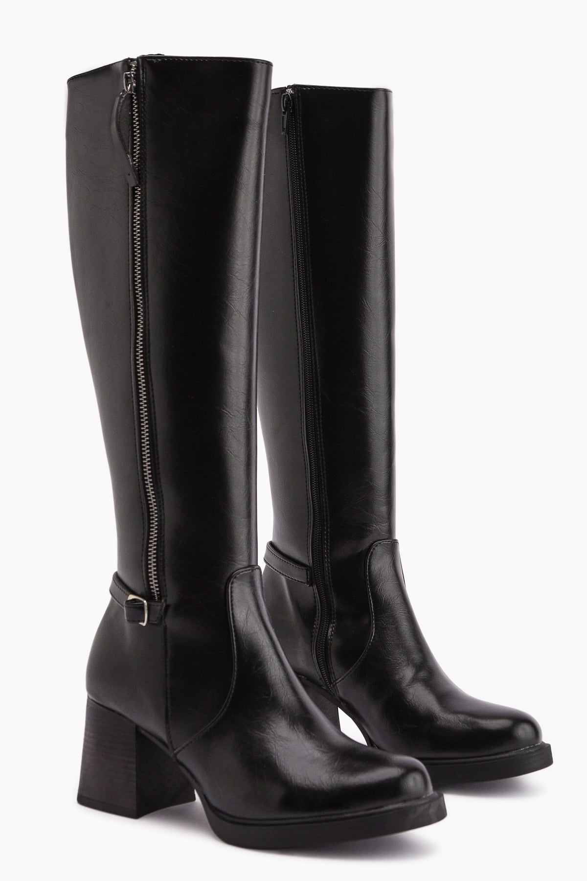 Nelia – Black Wide-Calf Heeled Knee-High Boot (Women)