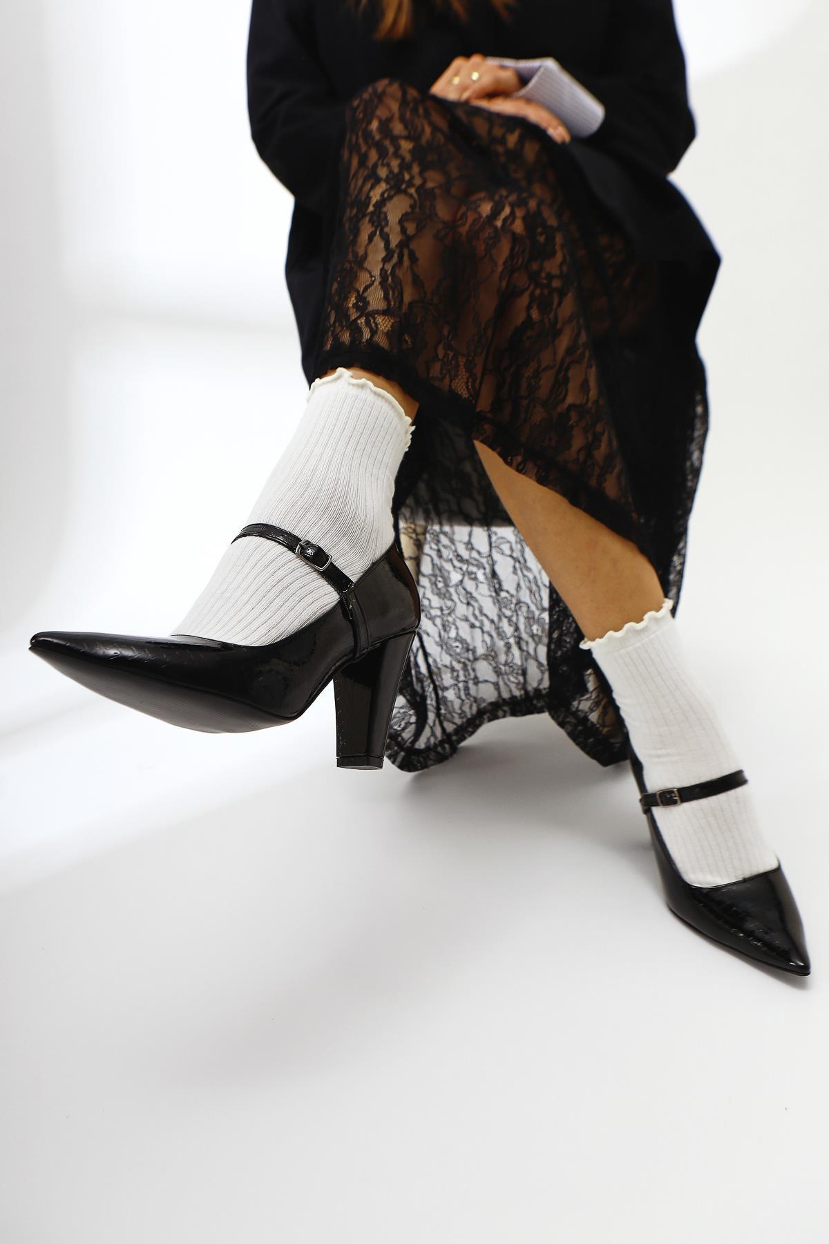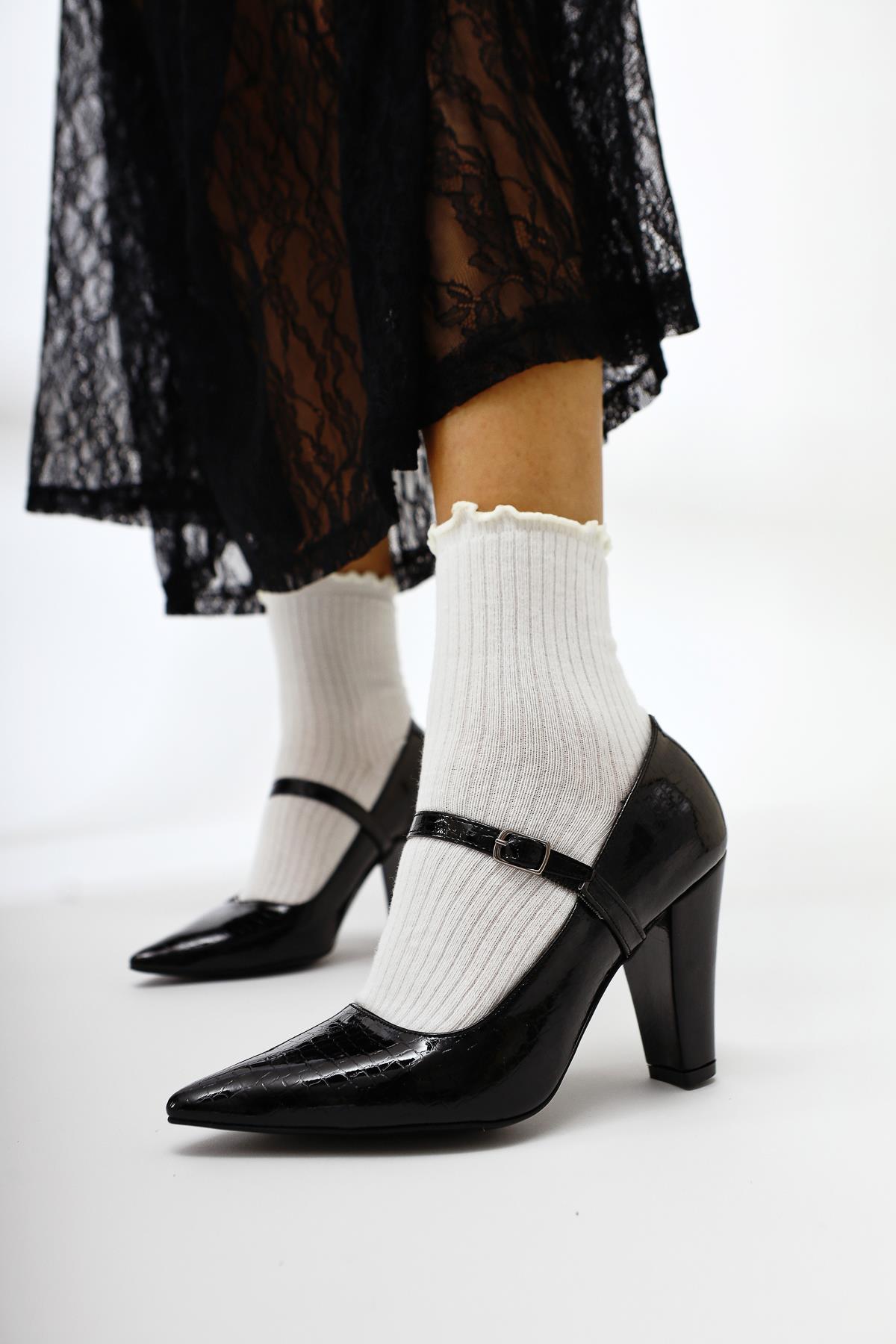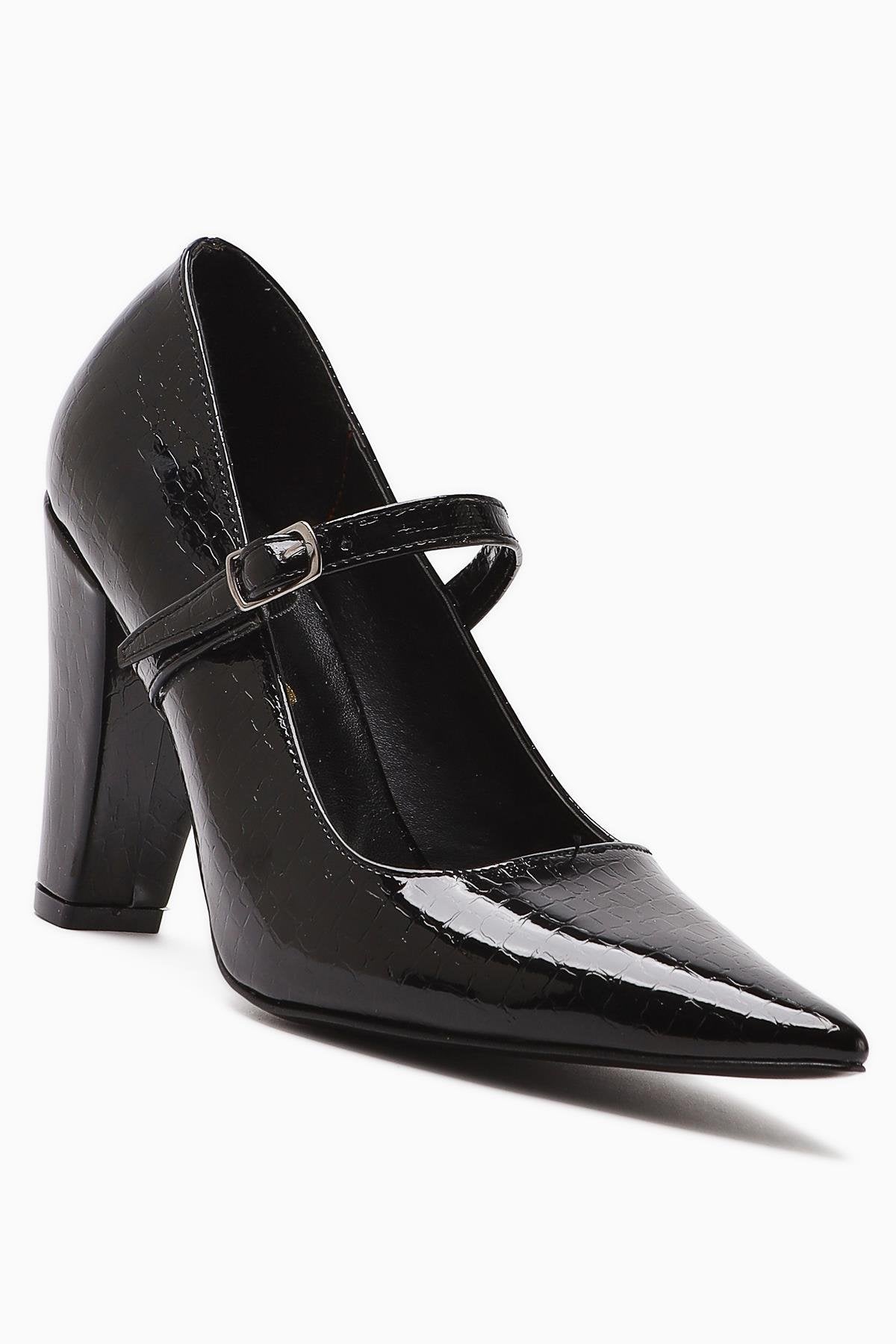 Beate – Schwarz Kroko-Lederoptik-Prägung Schuh mit spitzer Zehenpartie und Absatz (Damen)