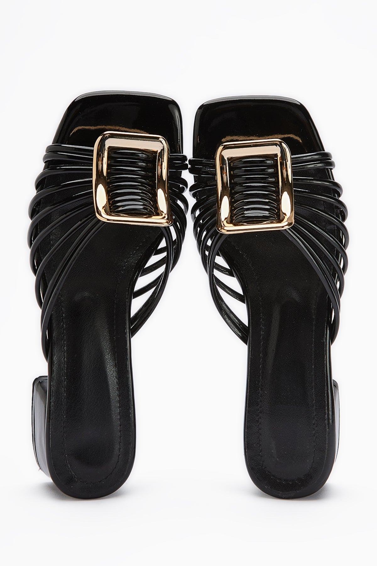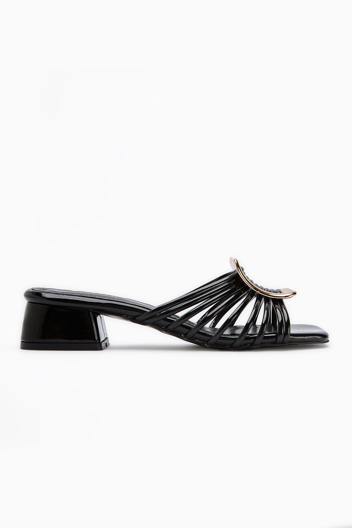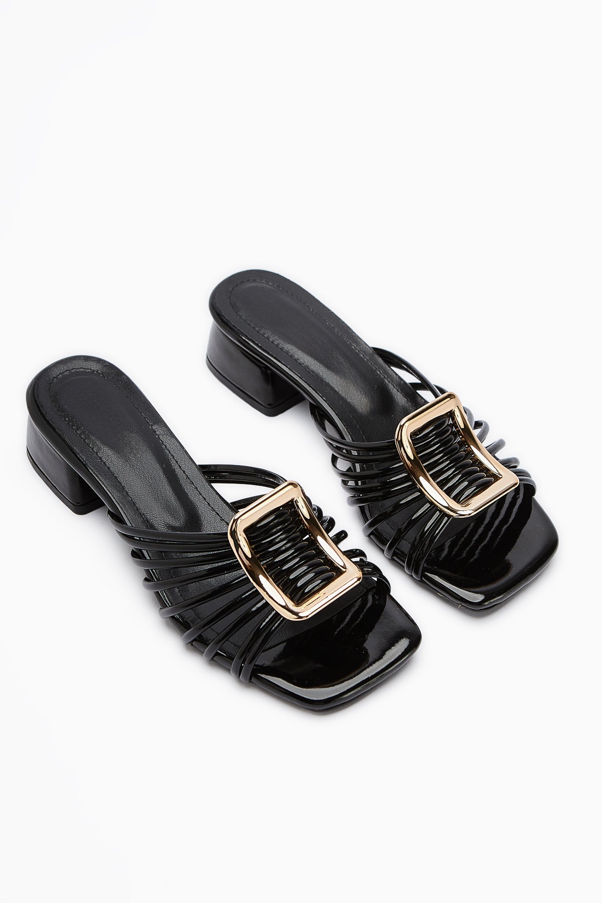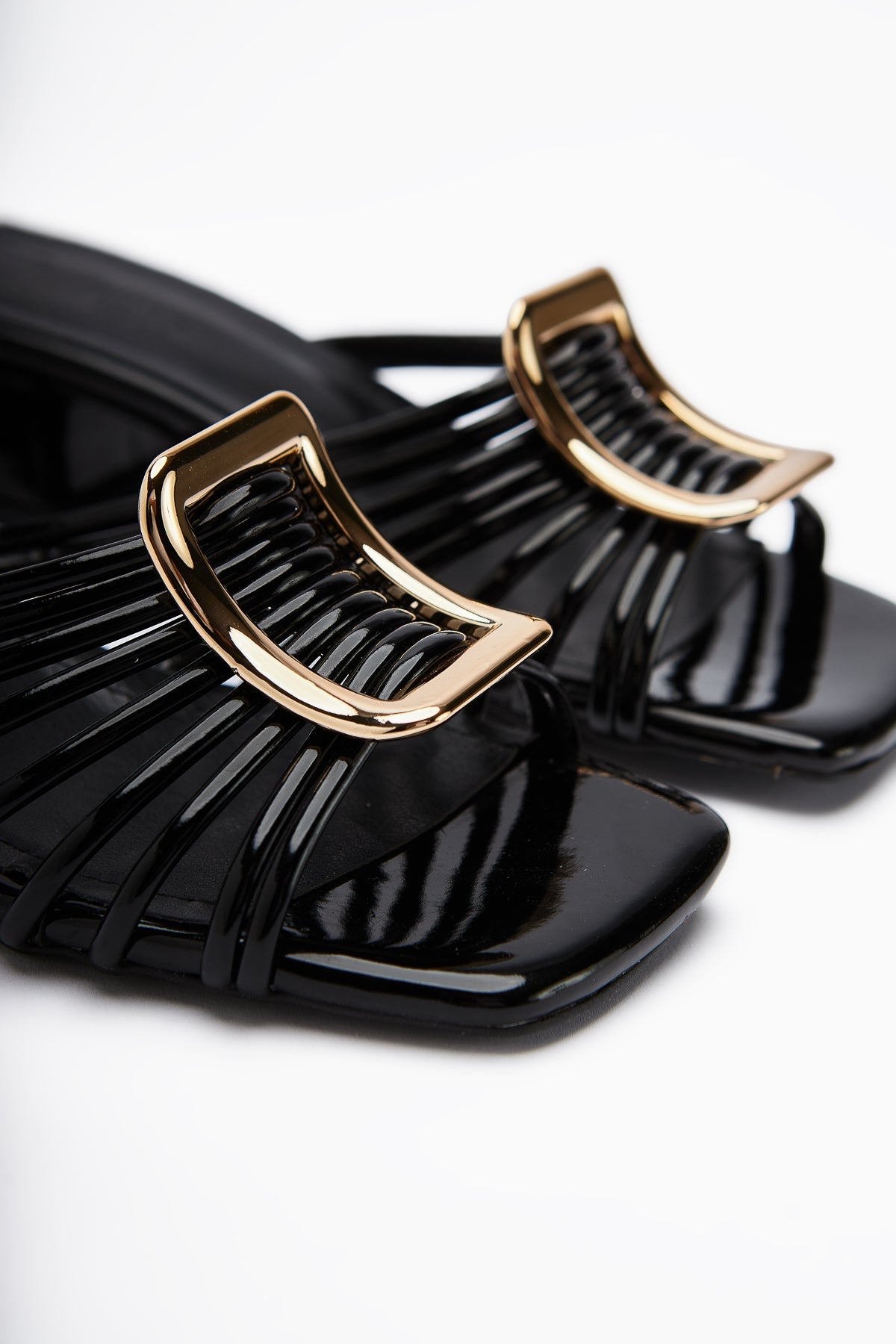 Greta Schwarze Lackleder Dicke Schnalle Niedriger Absatz Damen Hausschuhe