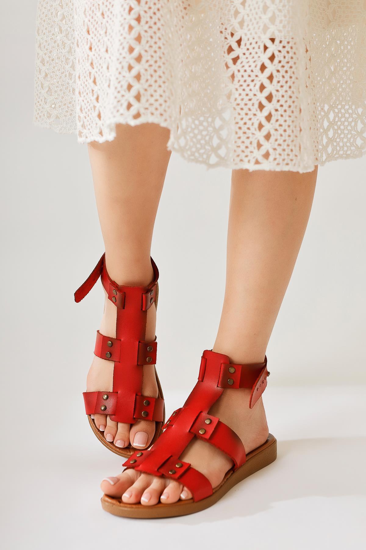 Rayen Echtes Leder Rote Dreifach-Riemen Nieten Gürtel Sandalen