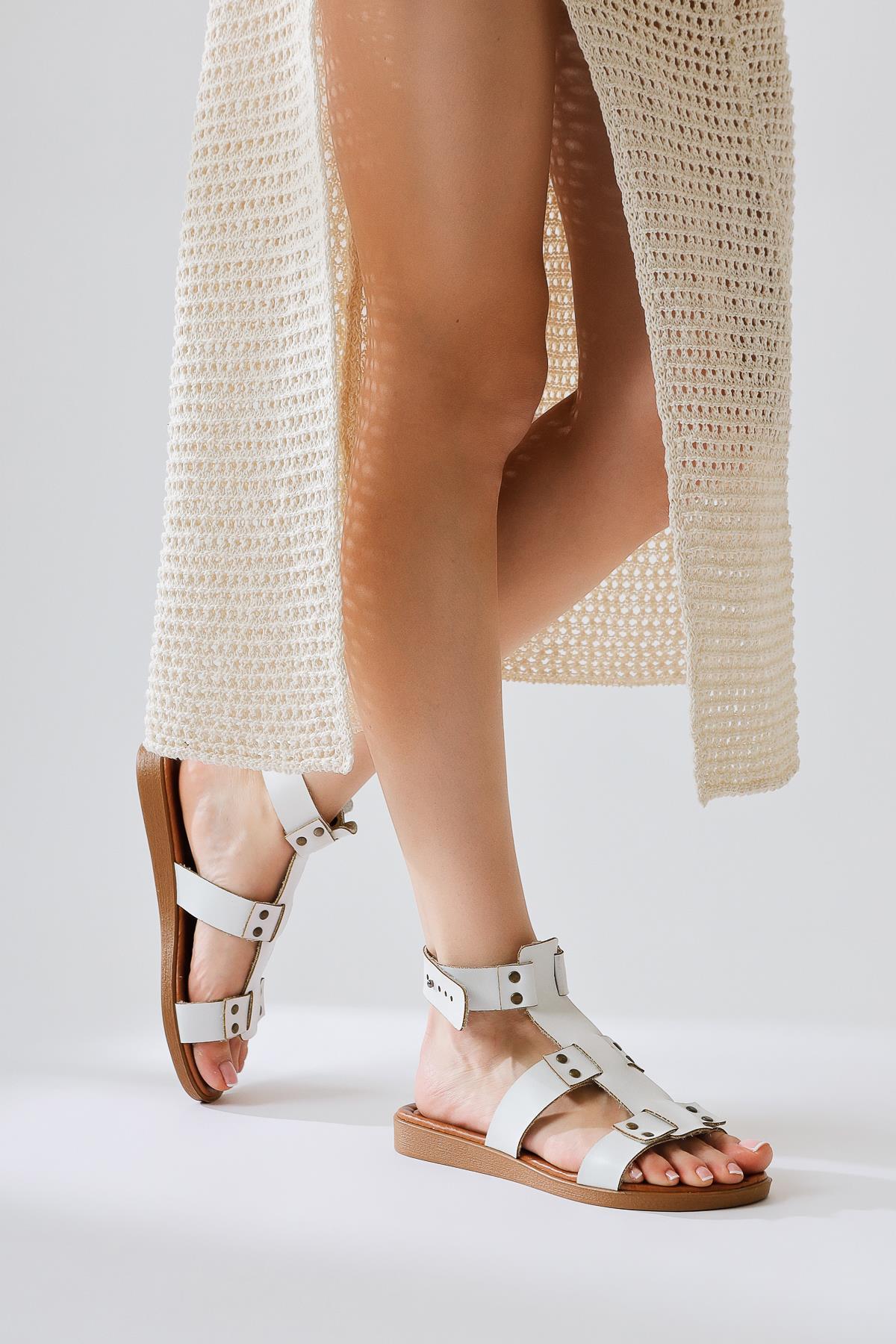 Rayen Echtes Leder Weiße Dreifachriemen-Sandalen mit Nieten-Detail