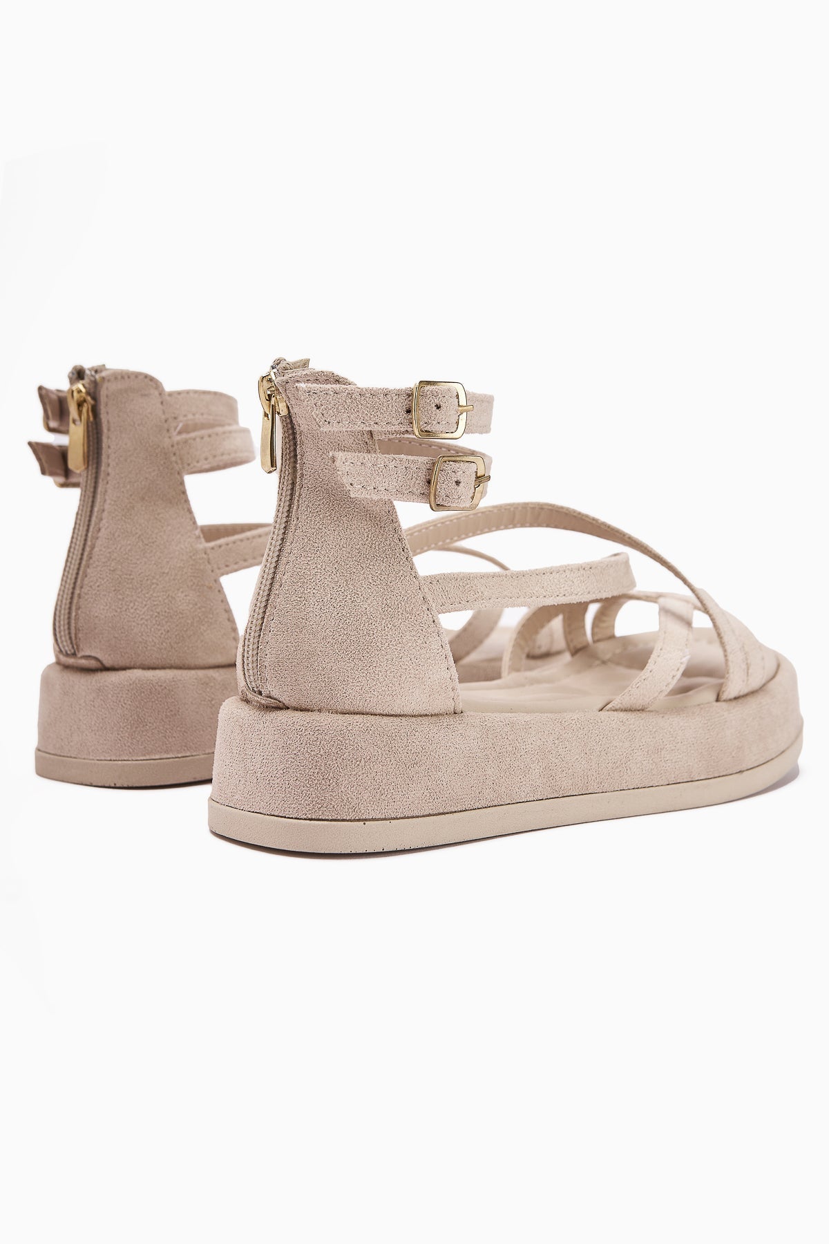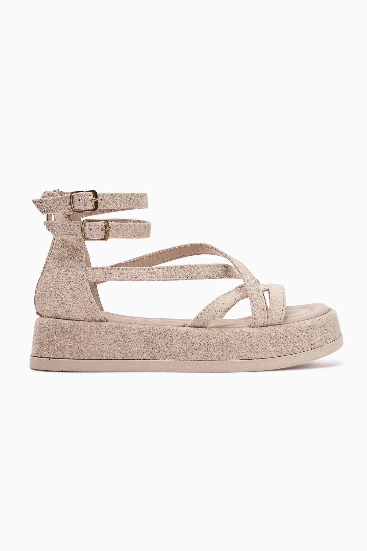 Sara Nude Wildleder Damen Sandale mit Kreuzriemen, Dicker Sohle, Knöchelschnalle